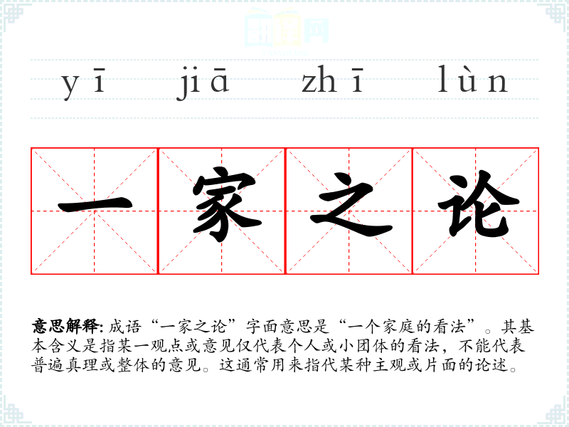 成语“一家之论”字面意思是“一个家庭的看法”。其基本含义是指某一观点或意见仅代表个人或小团体的看法,不能代表普遍真理或整体的意见。这通常用来指代某种主观或片面的论述。