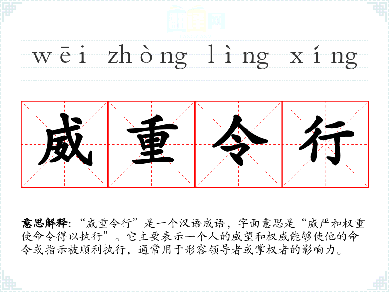 “威重令行”是一个汉语成语,字面意思是“威严和权重使命令得以执行”。它主要表示一个人的威望和权威能够使他的命令或指示被顺利执行,通常用于形容领导者或掌权者的影响力。