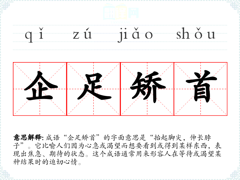 成语“企足矫首”的字面意思是“抬起脚尖,伸长脖子”。它比喻人们因为心急或渴望而想要看到或得到某样东西,表现出焦急、期待的状态。这个成语通常用来形容人在等待或渴望某种结果时的迫切心情。