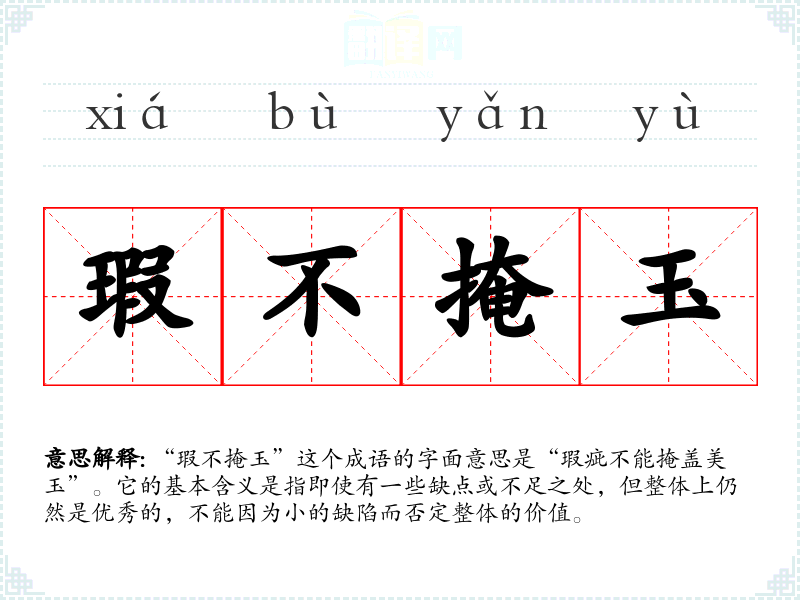 | 瑕不掩瑜 | 瑕:玉上面的斑点,比喻缺点;掩:遮盖;瑜:美玉的光泽,比喻优点。比喻缺点掩盖不了优点,缺点是次要的,优点是主要的。 |