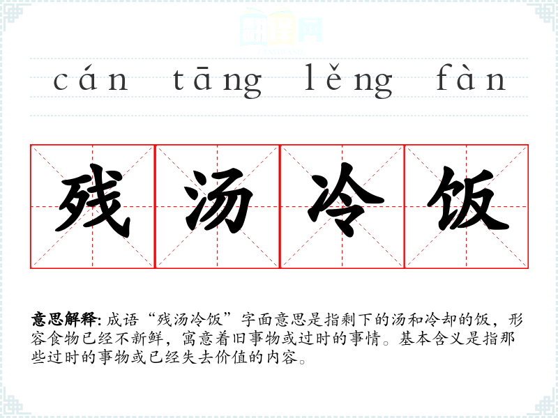 成语“残汤冷饭”字面意思是指剩下的汤和冷却的饭,形容食物已经不新鲜,寓意着旧事物或过时的事情。基本含义是指那些过时的事物或已经失去价值的内容。