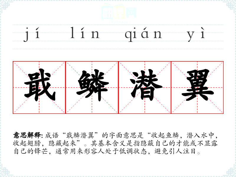 成语“戢鳞潜翼”的字面意思是“收起鱼鳞,潜入水中,收起翅膀,隐藏起来”。其基本含义是指隐蔽自己的才能或不显露自己的锋芒,通常用来形容人处于低调状态,避免引人注目。