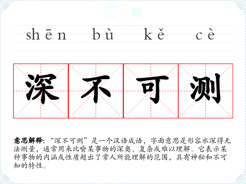 “深不可测”是一个汉语成语,字面意思是形容水深得无法测量,通常用来比喻某事物的深奥、复杂或难以理解。它表示某种事物的内涵或性质超出了常人所能理解的范围,具有神秘和不可知的特性。