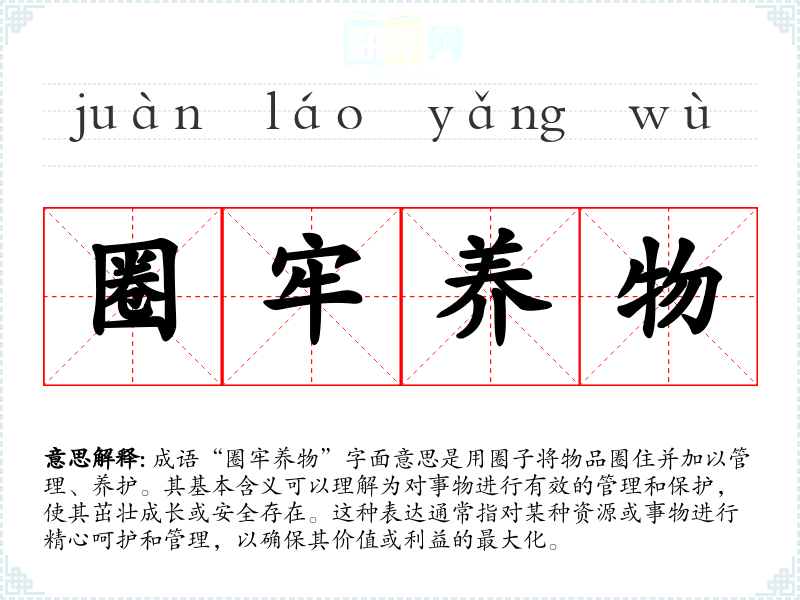 成语“圈牢养物”字面意思是用圈子将物品圈住并加以管理、养护。其基本含义可以理解为对事物进行有效的管理和保护,使其茁壮成长或安全存在。这种表达通常指对某种资源或事物进行精心呵护和管理,以确保其价值或利益的最大化。