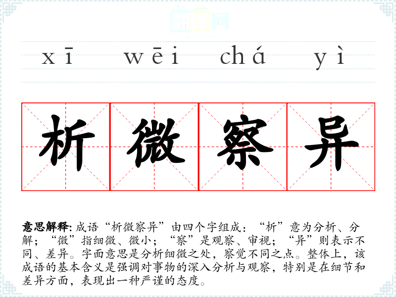 成语“析微察异”由四个字组成:“析”意为分析、分解;“微”指细微、微小;“察”是观察、审视;“异”则表示不同、差异。字面意思是分析细微之处,察觉不同之点。整体上,该成语的基本含义是强调对事物的深入分析与观察,特别是在细节和差异方面,表现出一种严谨的态度。