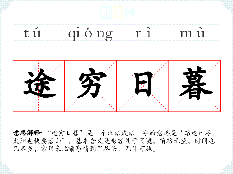 “途穷日暮”是一个汉语成语,字面意思是“路途已尽,太阳也快要落山”。基本含义是形容处于困境,前路无望,时间也已不多,常用来比喻事情到了尽头,无计可施。
