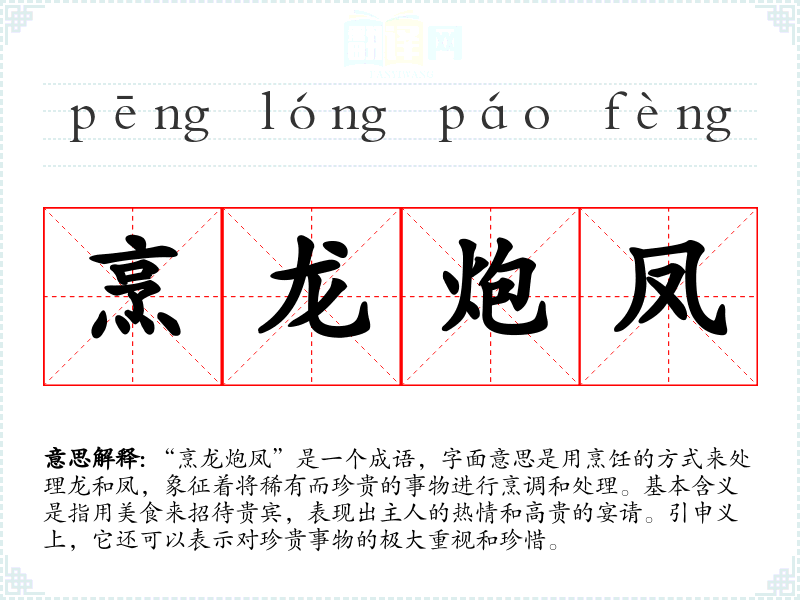 烹龙砲凤 ①比喻烹调珍奇肴馔。亦形容菜肴豪奢珍贵。②比喻高超的艺术技艺。亦作“烹龙庖凤”。亦作“烹龙煮凤”。