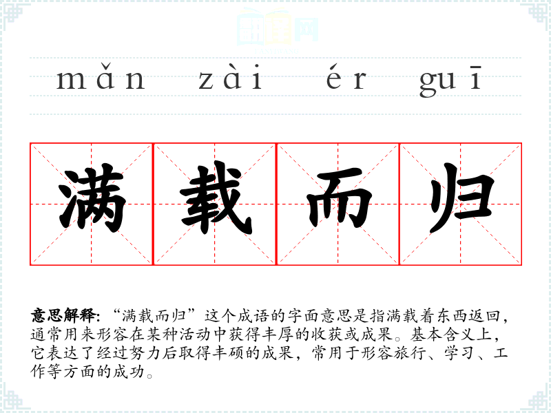 “满载而归”这个成语的字面意思是指满载着东西返回,通常用来形容在某种活动中获得丰厚的收获或成果。基本含义上,它表达了经过努力后取得丰硕的成果,常用于形容旅行、学*、工作等方面的成功。