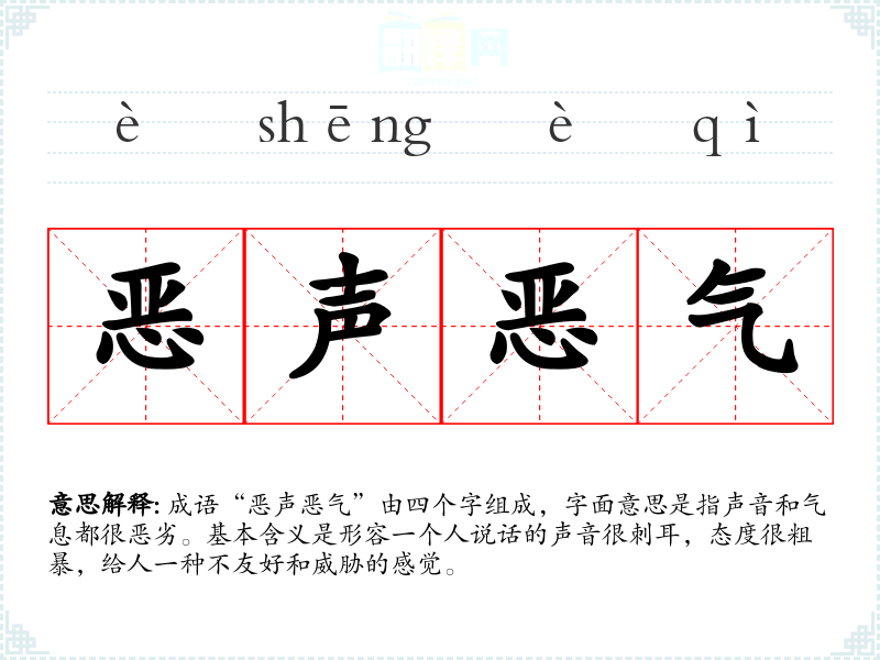 成语“恶声恶气”由四个字组成,字面意思是指声音和气息都很恶劣。基本含义是形容一个人说话的声音很刺耳,态度很粗暴,给人一种不友好和威胁的感觉。