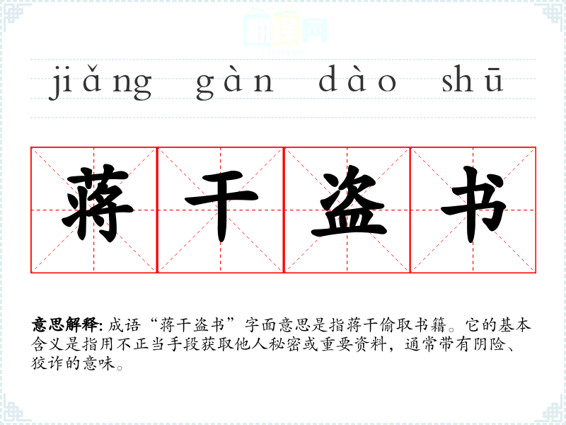 成语“蒋干盗书”字面意思是指蒋干偷取书籍。它的基本含义是指用不正当手段获取他人秘密或重要资料,通常带有阴险、狡诈的意味。