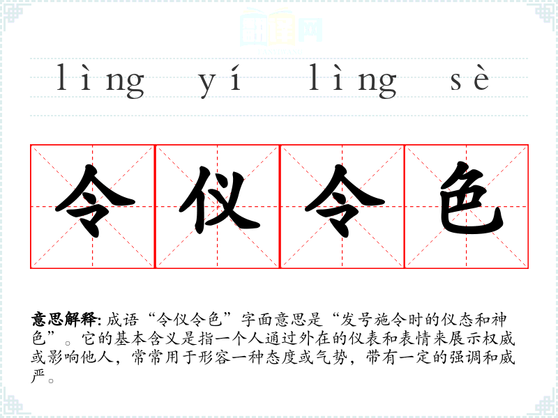 成语“令仪令色”字面意思是“发号施令时的仪态和神色”。它的基本含义是指一个人通过外在的仪表和表情来展示权威或影响他人,常常用于形容一种态度或气势,带有一定的强调和威严。