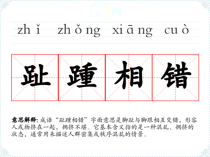 成语“趾踵相错”字面意思是脚趾与脚跟相互交错,形容人或物挤在一起,拥挤不堪。它基本含义指的是一种混乱、拥挤的状态,通常用来描述人群密集或秩序混乱的情景。