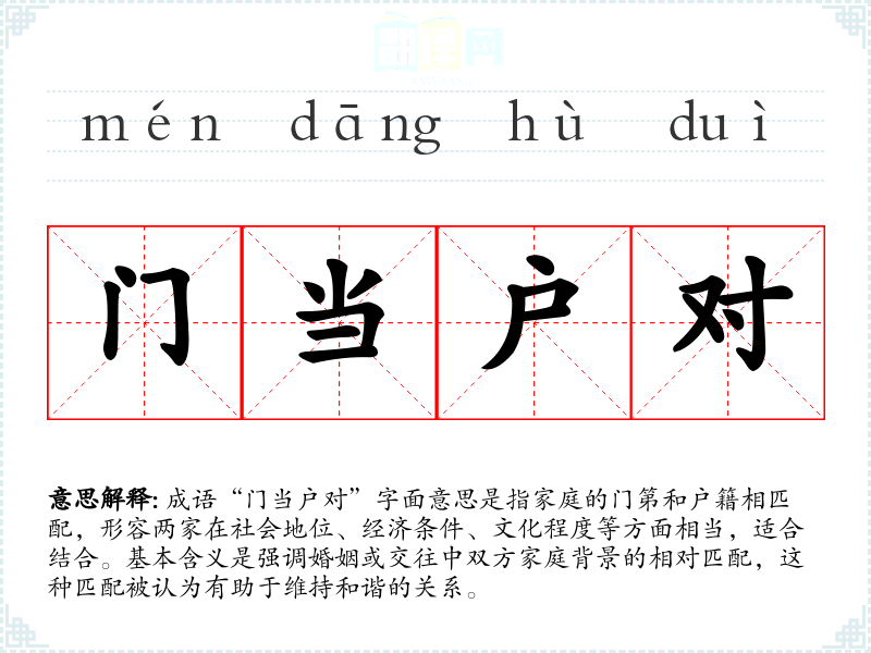 成语“门当户对”字面意思是指家庭的门第和户籍相匹配,形容两家在社会地位、经济条件、文化程度等方面相当,适合结合。基本含义是强调婚姻或交往中双方家庭背景的相对匹配,这种匹配被认为有助于维持和谐的关系。