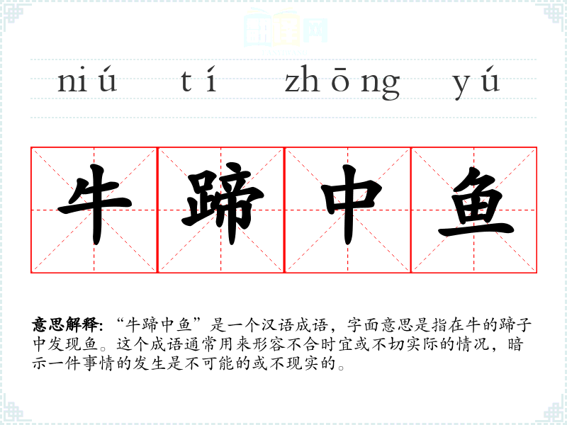 - 日常对话:当人们讨论一些不切实际的想法时,可以用“牛蹄中鱼”来形容。