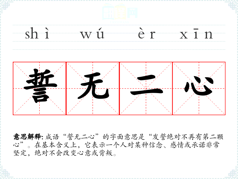 成语“誓无二心”的字面意思是“发誓绝对不再有第二颗心”。在基本含义上,它表示一个人对某种信念、感情或承诺非常坚定,绝对不会改变心意或背叛。
