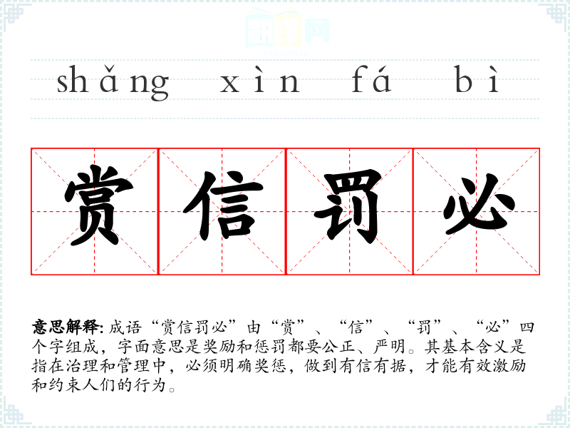 成语“赏信罚必”由“赏”、“信”、“罚”、“必”四个字组成,字面意思是奖励和惩罚都要公正、严明。其基本含义是指在治理和管理中,必须明确奖惩,做到有信有据,才能有效激励和约束人们的行为。