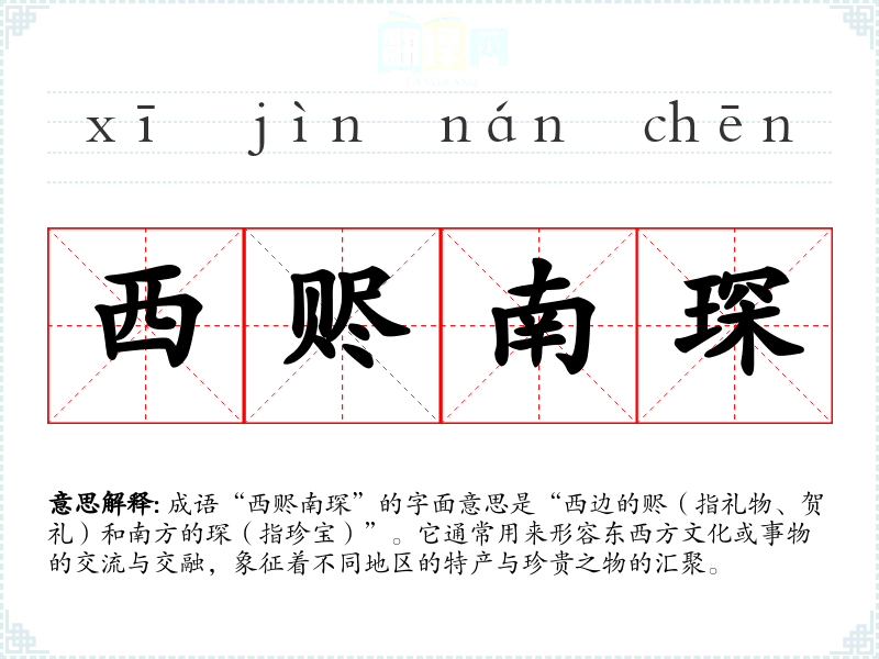 成语“西赆南琛”的字面意思是“西边的赆(指礼物、贺礼)和南方的琛(指珍宝)”。它通常用来形容东西方文化或事物的交流与交融,象征着不同地区的特产与珍贵之物的汇聚。