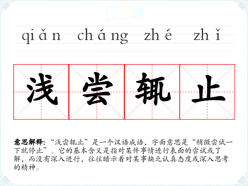 “浅尝辄止”是一个汉语成语,字面意思是“稍微尝试一下就停止”。它的基本含义是指对某件事情进行表面的尝试或了解,而没有深入进行,往往暗示着对某事缺乏认真态度或深入思考的精神。