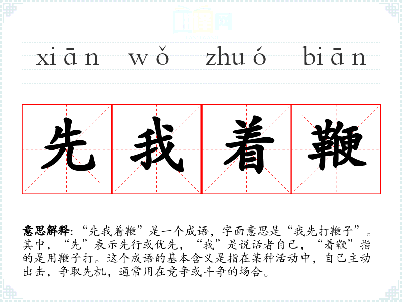 “先我着鞭”是一个成语,字面意思是“我先打鞭子”。其中,“先”表示先行或优先,“我”是说话者自己,“着鞭”指的是用鞭子打。这个成语的基本含义是指在某种活动中,自己主动出击,争取先机,通常用在竞争或斗争的场合。