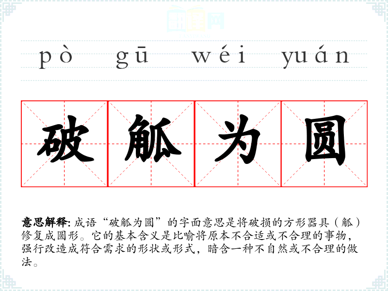 成语“破觚为圆”的字面意思是将破损的方形器具(觚)修复成圆形。它的基本含义是比喻将原本不合适或不合理的事物,强行改造成符合需求的形状或形式,暗含一种不自然或不合理的做法。