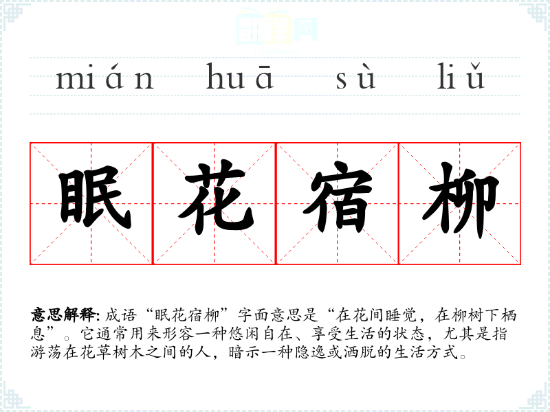 成语“眠花宿柳”字面意思是“在花间睡觉,在柳树下栖息”。它通常用来形容一种悠闲自在、享受生活的状态,尤其是指游荡在花草树木之间的人,暗示一种隐逸或洒脱的生活方式。
