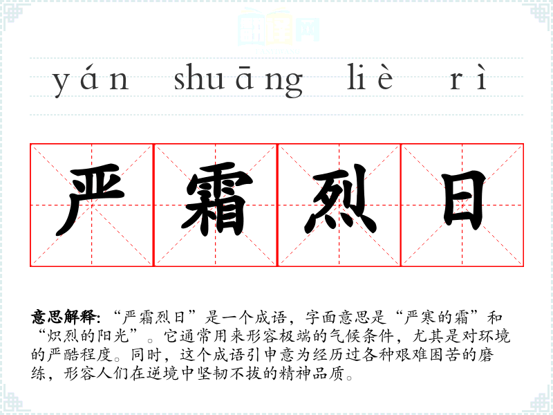 “严霜烈日”是一个成语,字面意思是“严寒的霜”和“炽烈的阳光”。它通常用来形容极端的气候条件,尤其是对环境的严酷程度。同时,这个成语引申意为经历过各种艰难困苦的磨练,形容人们在逆境中坚韧不拔的精神品质。