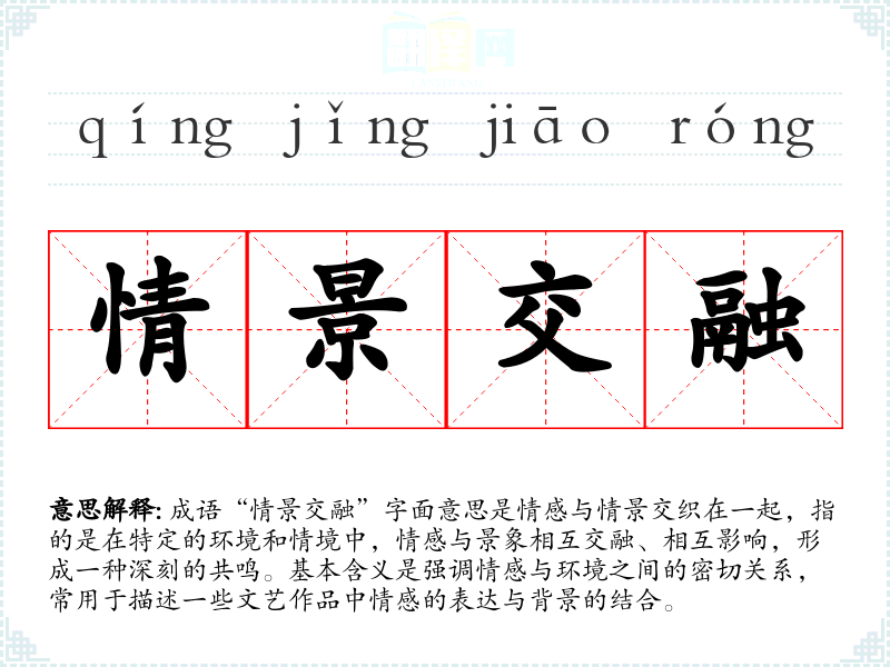成语“情景交融”字面意思是情感与情景交织在一起,指的是在特定的环境和情境中,情感与景象相互交融、相互影响,形成一种深刻的共鸣。基本含义是强调情感与环境之间的密切关系,常用于描述一些文艺作品中情感的表达与背景的结合。