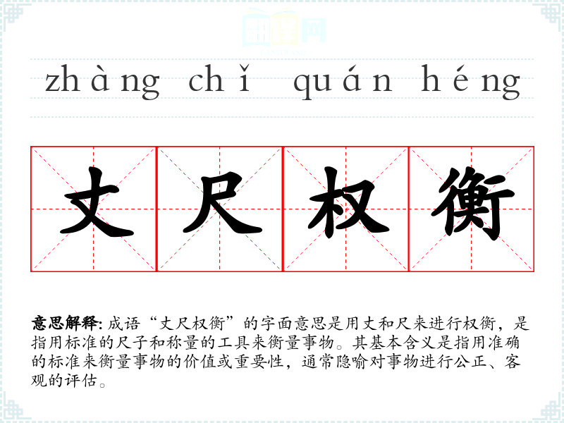 成语“丈尺权衡”的字面意思是用丈和尺来进行权衡,是指用标准的尺子和称量的工具来衡量事物。其基本含义是指用准确的标准来衡量事物的价值或重要性,通常隐喻对事物进行公正、客观的评估。