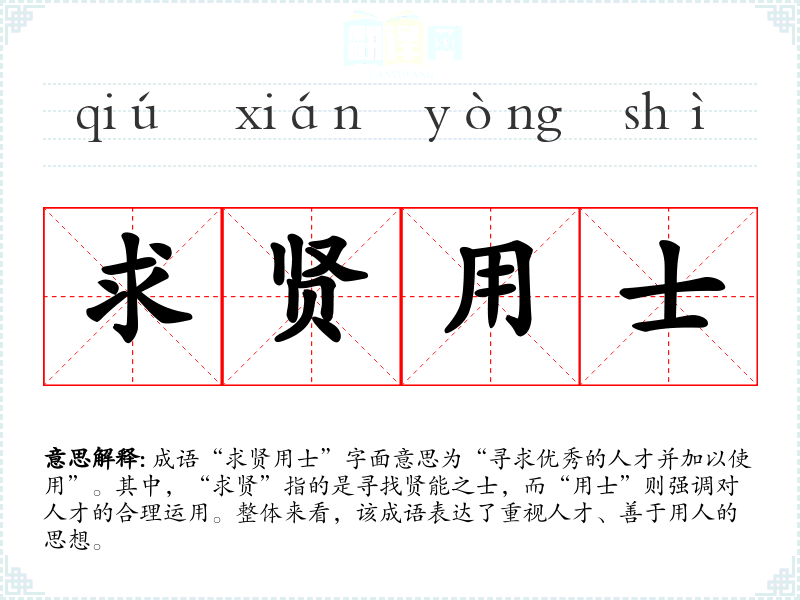 成语“求贤用士”字面意思为“寻求优秀的人才并加以使用”。其中,“求贤”指的是寻找贤能之士,而“用士”则强调对人才的合理运用。整体来看,该成语表达了重视人才、善于用人的思想。
