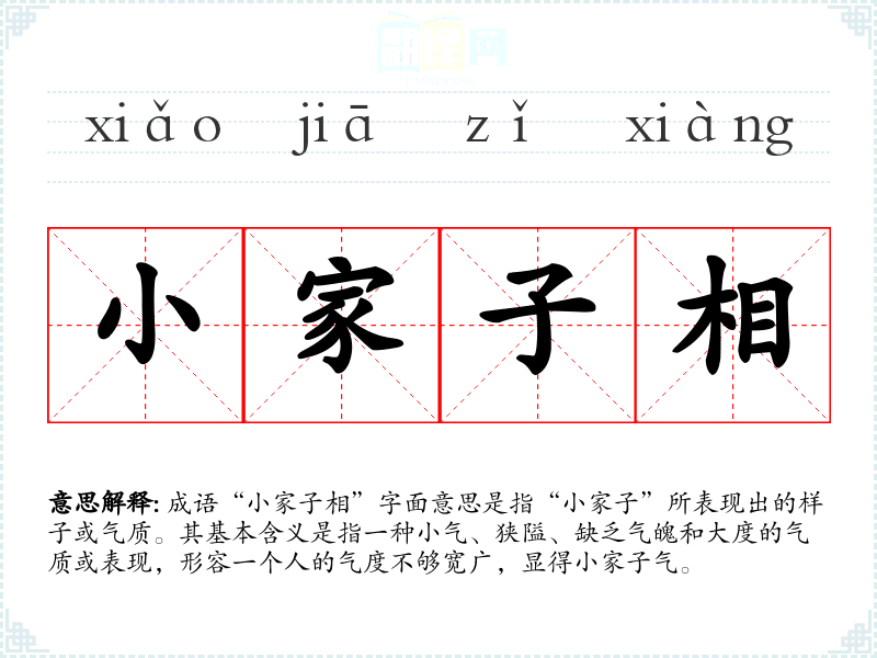 成语“小家子相”字面意思是指“小家子”所表现出的样子或气质。其基本含义是指一种小气、狭隘、缺乏气魄和大度的气质或表现,形容一个人的气度不够宽广,显得小家子气。