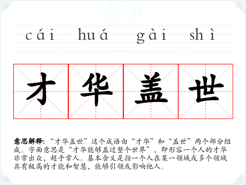“才华盖世”这个成语由“才华”和“盖世”两个部分组成。字面意思是“才华能够盖过整个世界”,即形容一个人的才华非常出众,超乎常人。基本含义是指一个人在某一领域或多个领域具有极高的才能和智慧,能够引领或影响他人。