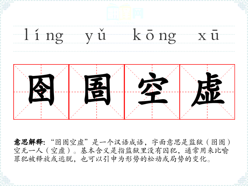 “囹圄空虚”是一个汉语成语,字面意思是监狱(囹圄)空无一人(空虚)。基本含义是指监狱里没有囚犯,通常用来比喻罪犯被释放或逃脱,也可以引申为形势的松动或局势的变化。