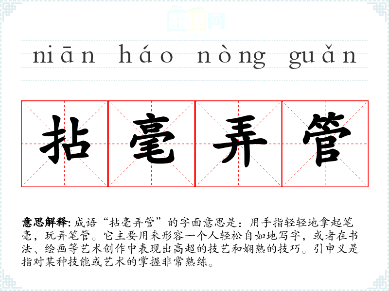 在**传统文化中,书法被视为一种重要的艺术形式,代表着个人修养和文化素养。“拈毫弄管”作为一个成语,体现了文人对书法的重视和追求。在现代社会,虽然书法的地位有所变化,但仍然被广泛认可为一种艺术形式,其技艺的熟练程度仍然受到人们的赞赏。