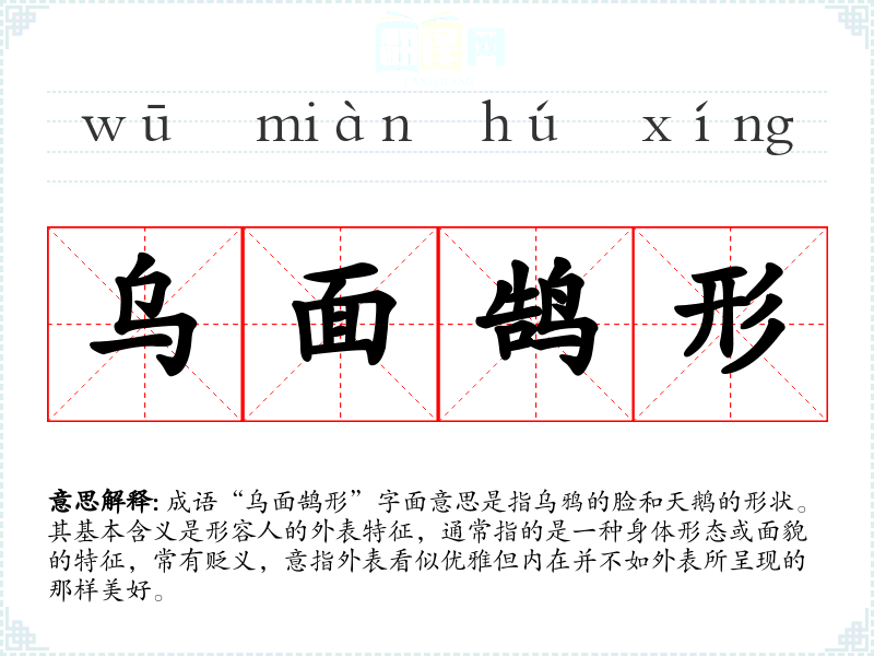 成语“乌面鹄形”字面意思是指乌鸦的脸和天鹅的形状。其基本含义是形容人的外表特征,通常指的是一种身体形态或面貌的特征,常有贬义,意指外表看似优雅但内在并不如外表所呈现的那样美好。