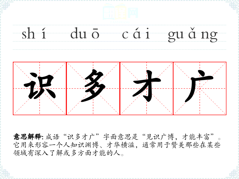 成语“识多才广”字面意思是“见识广博,才能丰富”。它用来形容一个人知识渊博、才华横溢,通常用于赞美那些在某些领域有深入了解或多方面才能的人。