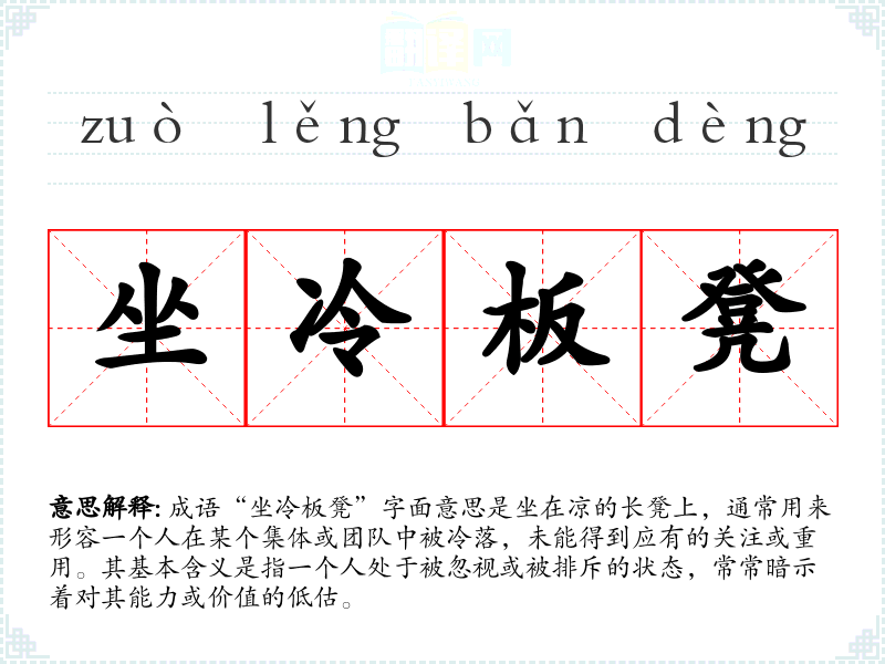 成语“坐冷板凳”字面意思是坐在凉的长凳上,通常用来形容一个人在某个集体或团队中被冷落,未能得到应有的关注或重用。其基本含义是指一个人处于被忽视或被排斥的状态,常常暗示着对其能力或价值的低估。