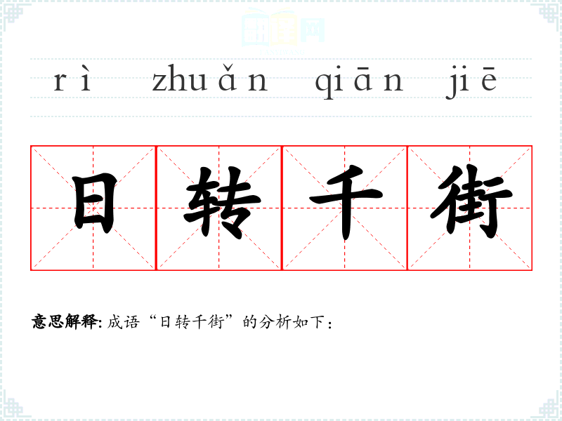 成语“日转千街”并没有明确的历史典故或文学出处,可能是现代汉语中逐渐形成的表达。它可以视为一种对日常生活的描写,反映了人们对时间流逝和城市生活的观察。