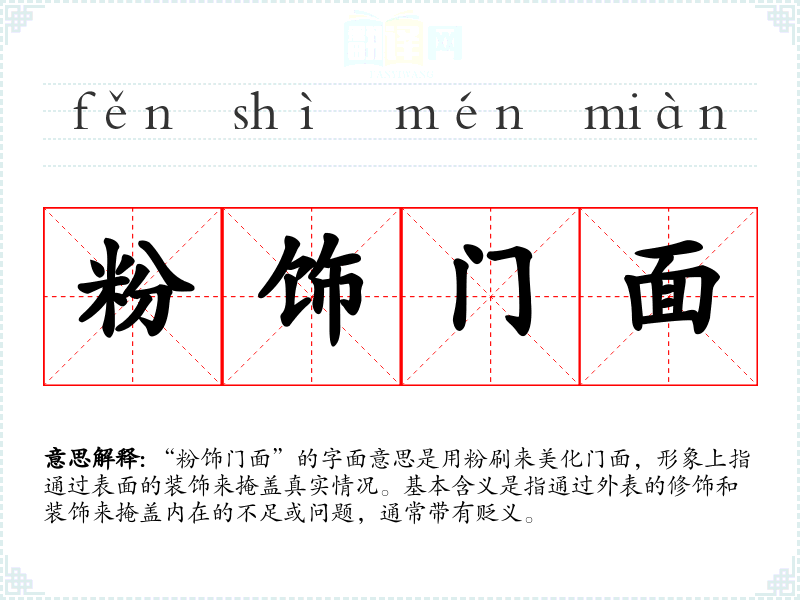 “粉饰门面”的字面意思是用粉刷来美化门面,形象上指通过表面的装饰来掩盖真实情况。基本含义是指通过外表的修饰和装饰来掩盖内在的不足或问题,通常带有贬义。
