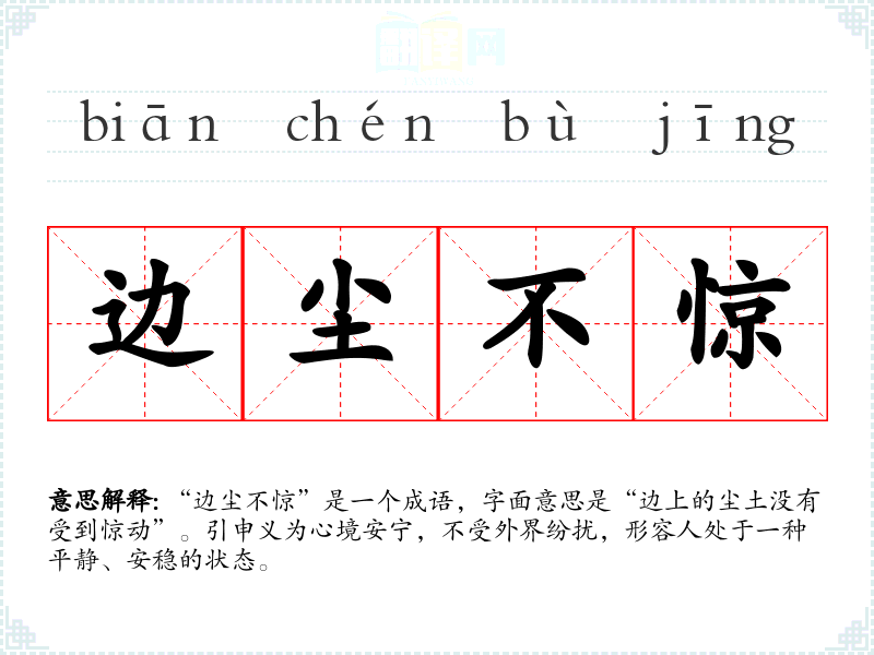 “边尘不惊”是一个成语,字面意思是“边上的尘土没有受到惊动”。引申义为心境安宁,不受外界纷扰,形容人处于一种平静、安稳的状态。