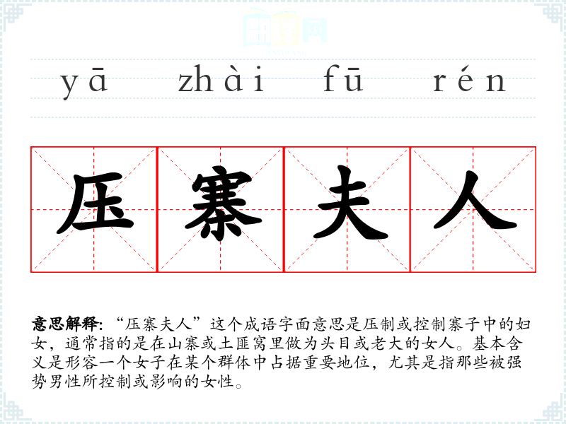 “压寨夫人”这个成语字面意思是压制或控制寨子中的妇女,通常指的是在山寨或土匪窝里做为头目或老大的女人。基本含义是形容一个女子在某个群体中占据重要地位,尤其是指那些被强势男性所控制或影响的女性。
