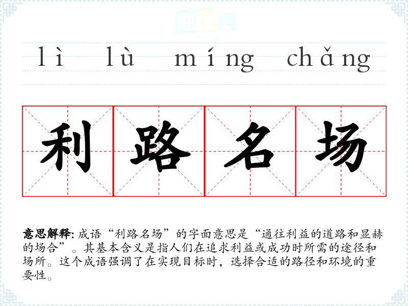 成语“利路名场”的字面意思是“通往利益的道路和显赫的场合”。其基本含义是指人们在追求利益或成功时所需的途径和场所。这个成语强调了在实现目标时,选择合适的路径和环境的重要性。