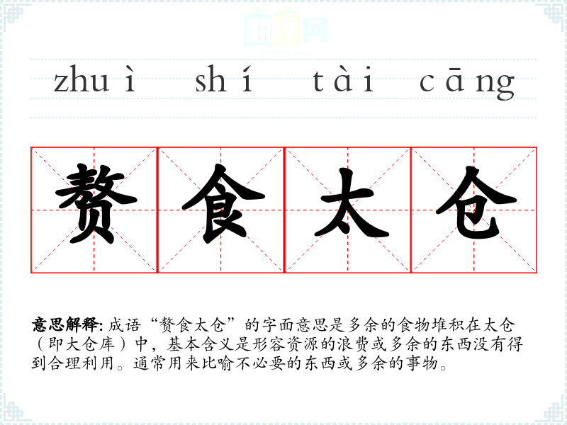 成语“赘食太仓”的字面意思是多余的食物堆积在太仓(即大仓库)中,基本含义是形容资源的浪费或多余的东西没有得到合理利用。通常用来比喻不必要的东西或多余的事物。
