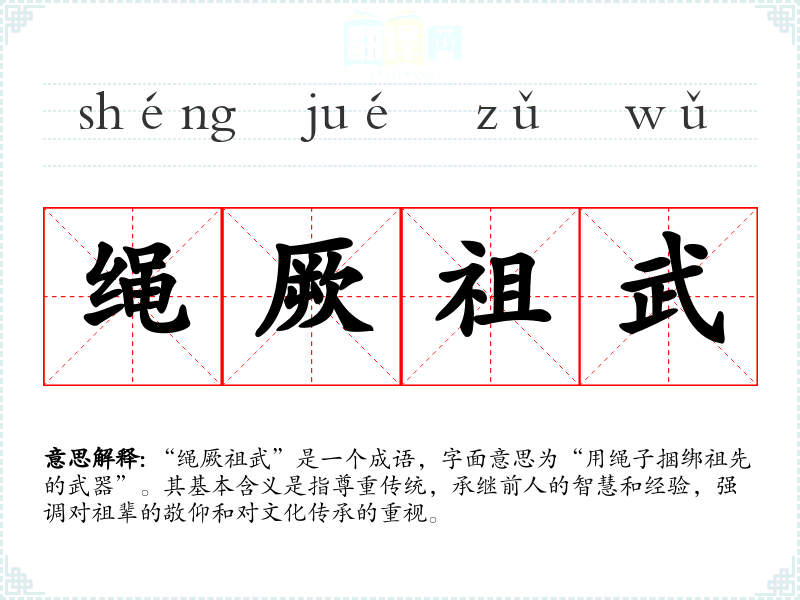 “绳厥祖武”是一个成语,字面意思为“用绳子捆绑祖先的武器”。其基本含义是指尊重传统,承继前人的智慧和经验,强调对祖辈的敬仰和对文化传承的重视。