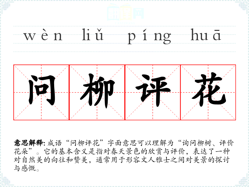 成语“问柳评花”字面意思可以理解为“询问柳树、评价花朵”。它的基本含义是指对春天景色的欣赏与评价,表达了一种对自然美的向往和赞美,通常用于形容文人雅士之间对美景的探讨与感慨。