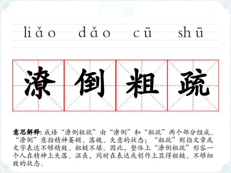 成语“潦倒粗疏”由“潦倒”和“粗疏”两个部分组成。“潦倒”意指精神萎顿、落魄、失意的状态;“粗疏”则指文章或文字表达不够精致、粗糙不堪。因此,整体上“潦倒粗疏”形容一个人在精神上失落、沮丧,同时在表达或创作上显得粗糙、不够细致的状态。