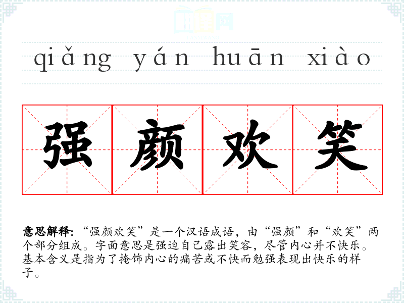 “强颜欢笑”是一个汉语成语,由“强颜”和“欢笑”两个部分组成。字面意思是强迫自己露出笑容,尽管内心并不快乐。基本含义是指为了掩饰内心的痛苦或不快而勉强表现出快乐的样子。