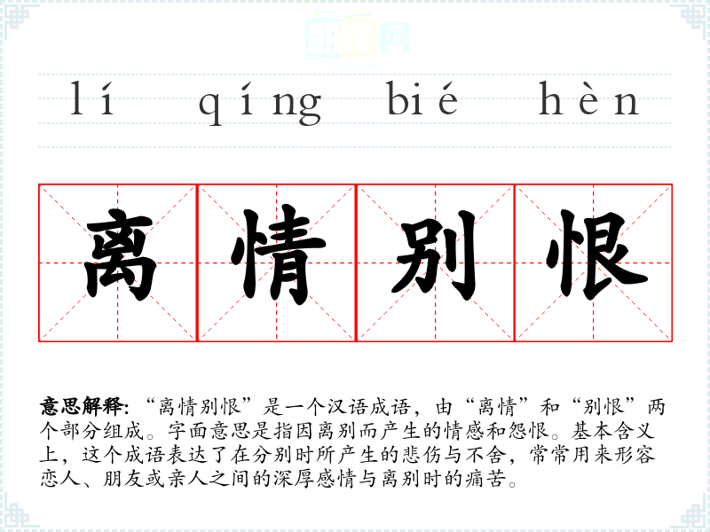 “离情别恨”是一个汉语成语,由“离情”和“别恨”两个部分组成。字面意思是指因离别而产生的情感和怨恨。基本含义上,这个成语表达了在分别时所产生的悲伤与不舍,常常用来形容恋人、朋友或亲人之间的深厚感情与离别时的痛苦。