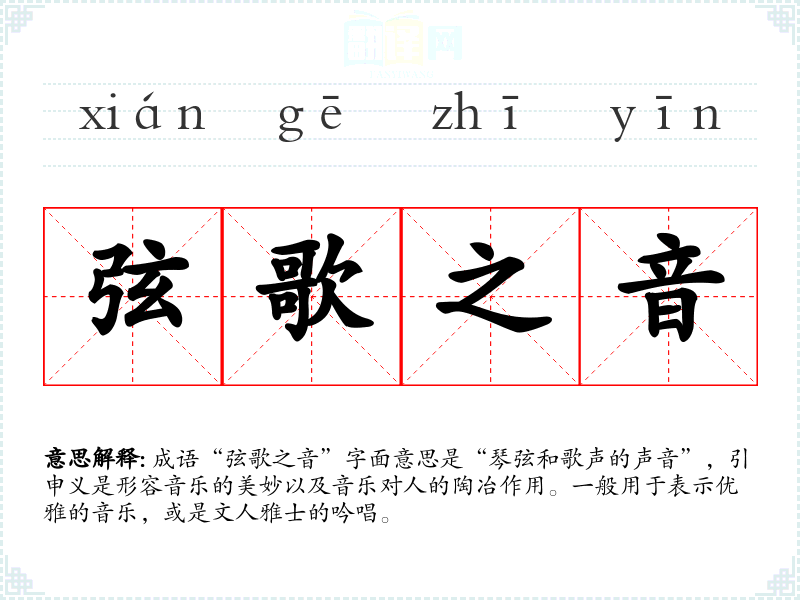 成语“弦歌之音”字面意思是“琴弦和歌声的声音”,引申义是形容音乐的美妙以及音乐对人的陶冶作用。一般用于表示优雅的音乐,或是文人雅士的吟唱。