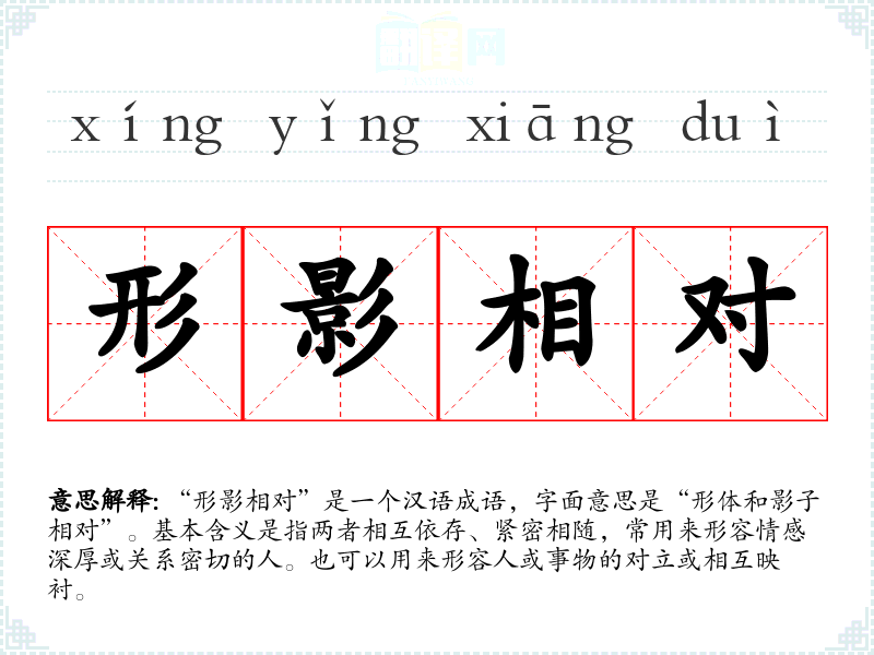 “形影相对”是一个汉语成语,字面意思是“形体和影子相对”。基本含义是指两者相互依存、紧密相随,常用来形容情感深厚或关系密切的人。也可以用来形容人或事物的对立或相互映衬。