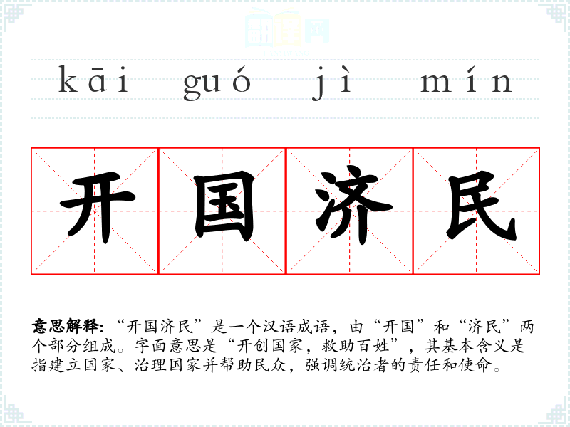 “开国济民”是一个汉语成语,由“开国”和“济民”两个部分组成。字面意思是“开创国家,救助百姓”,其基本含义是指建立国家、治理国家并帮助民众,强调统治者的责任和使命。